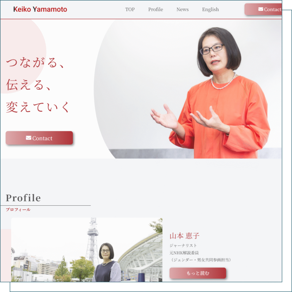 枝廣さんがすごいのは「本質を見抜く力」です。私がやりたいこと、得意なことは何か、しっかり見極め、キャッチコピー「つながる、伝える、変えていく」を考え写真のイメージ含めトータルでデザインしてくださり、ホームページを見ると“山本恵子”がわかる、と好評です。