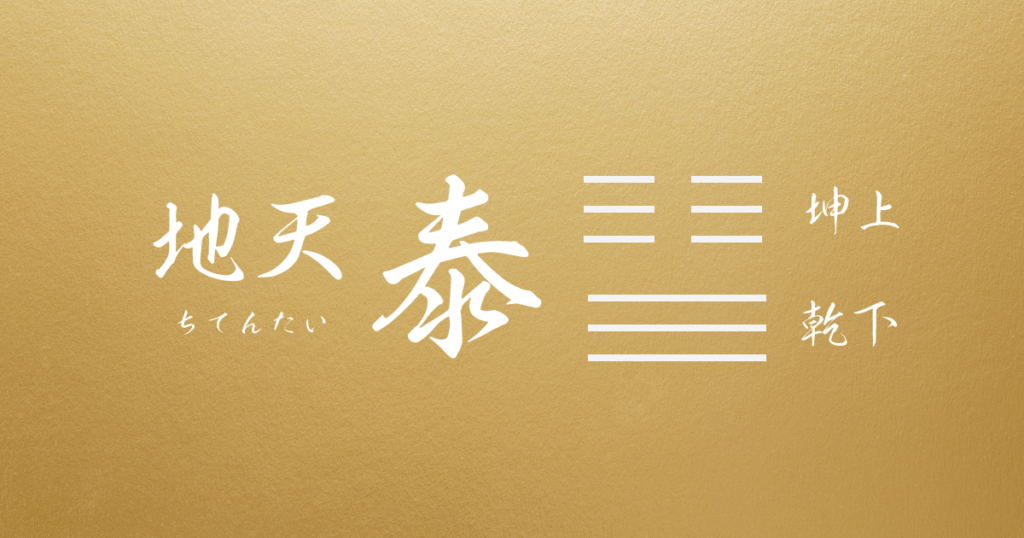 地天泰は天下泰平のおめでたい卦。地をあらわす坤の卦が上から下に降りてきて、天をあらわす乾の卦が下から上へと上がってゆくから、天と地の気、陰と陽との気が相交わり相通じて万物が生成化育される。人事でいえば、君主の恩恵が人民に通じ、人民の状態が君主に通じる。君主と臣下の意志感情がよく疎通する。安らかに事が運んで吉を得る。成そうとすることは盛んに伸びてゆく。