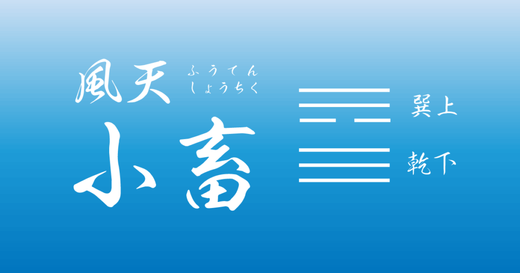 • 小畜は小さいもの(陰)が大きいもの(陽)を畜(とど)める卦。君主に悪い行いがあるとき、臣下がそれを諫め止めようとするが容易でない。それでも臣下は従順の徳をもって君主の心を和らげる。