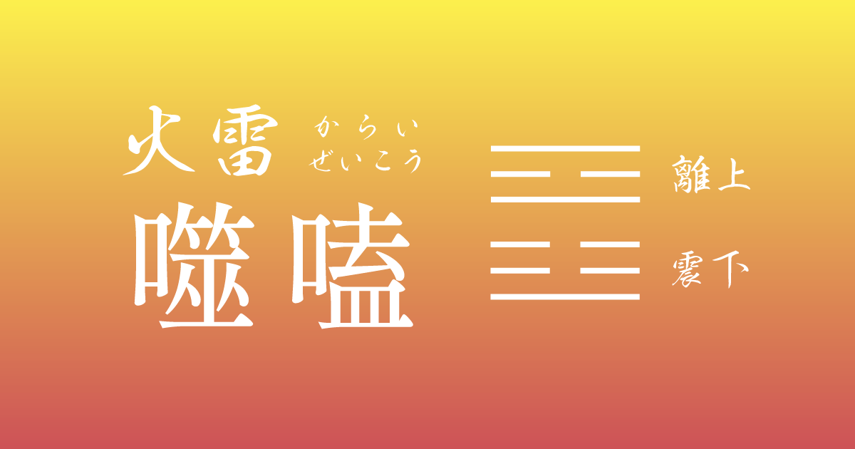 噬嗑とは、噛んで合うこと。世の中の平和を妨げる邪魔者を噛み砕いて、世の中が和合一致する。あるものと他のものが合同しようとするときには、必ずその内部かまたは外部かに、合同することに賛成しないものがある。それでも万障を打ち砕いて合同する道を説くのがこの卦。明智をもって和合を妨害するものの情態を知り、盛んなる威力をもって妨害するものを除き去る。邪魔をするものは、他人を讒言する姦悪なる人とか、剛頑にして始末に困る人という場合もあるが、無形のものが妨害している場合も多い。邪魔者を除くには、刑獄を用いて、その邪魔者を罰して懲らす。
