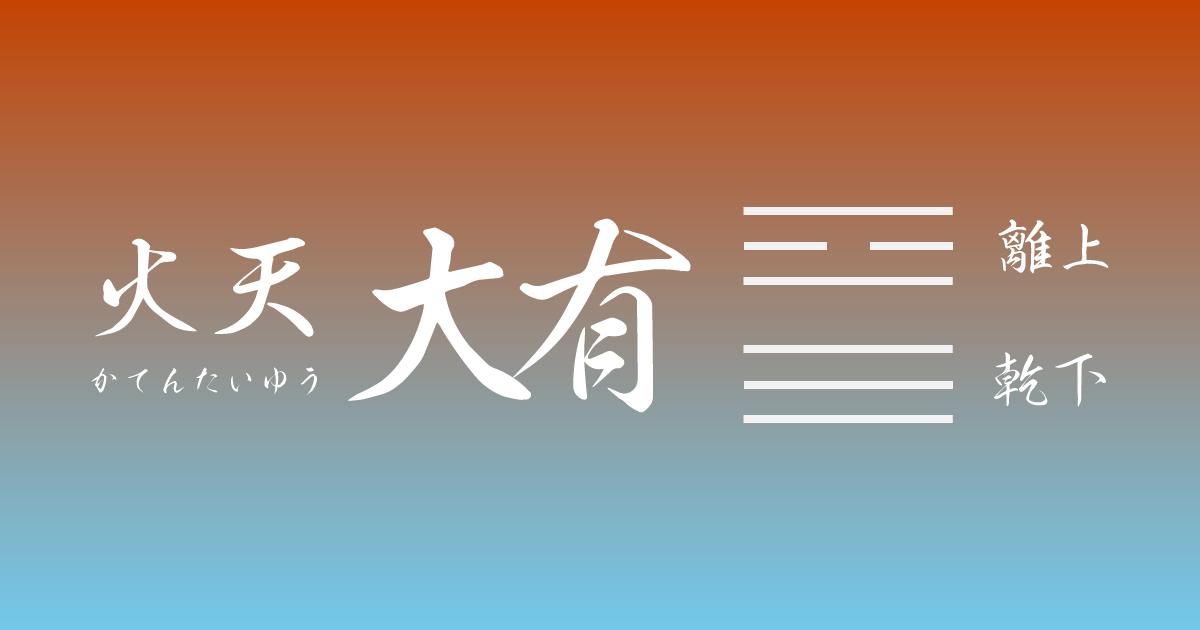 火天大有は、上に乾の卦の天、下に離の卦の火がある。太陽が天上にあって普く天下を照らす景気のよい盛大な卦。たくさんの物を自分の所有として持っている。国が大きく、人民が多く、財産・所有物が大きい。この卦の主爻の六五の天子は従順にして中庸の徳を持っており、自分の心を虚しくして上下の五つの陽爻=天下の賢人を信任している。自分は大きな才能を持っているのではないけれども、賢人を用いることで自分に多少の才能があった場合よりはるかに大きな成果を挙げている。