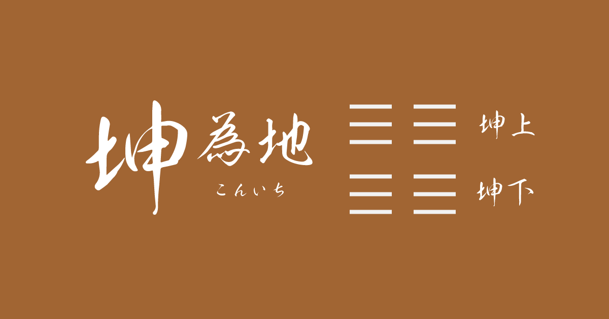 坤(こん)は元亨利(げんこうり)、牝馬(ひんば)の貞(てい)。 [坤(こん)は元(おおい)に亨(とお)る、牝馬(ひんば)の貞(てい)に利(よろ)し。] 君子(くんし)、往(ゆ)く攸(ところ)有(あ)り、先(さき)んずれば迷(まよ)い、後(おく)るれば主(しゅ)を得(う)。西南(せいなん)に朋(とも)を得(え)、東北(とうほく)に朋(とも)を喪(うしな)うに利(よろ)し。貞(てい)に安(やす)んずれば吉(きつ)。