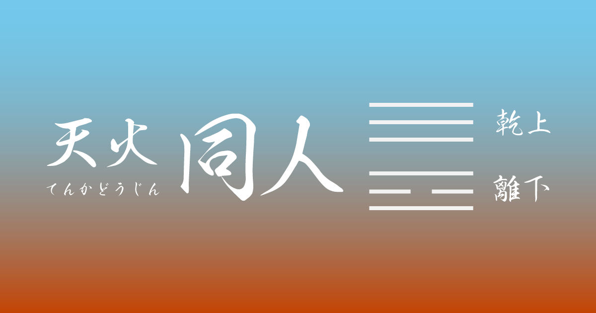 - この卦は、上に乾の卦の天があり、下に離の卦の火がある。火が燃えて天に向かって上ることを天と志を同じくするものとして、同人の卦の象となっている。また下の離の卦を日、太陽ともみる。天と日は密接な関係で離れることなく一緒に運行している。天と火は異なるものであるけれども、同じ方向に向かっている。